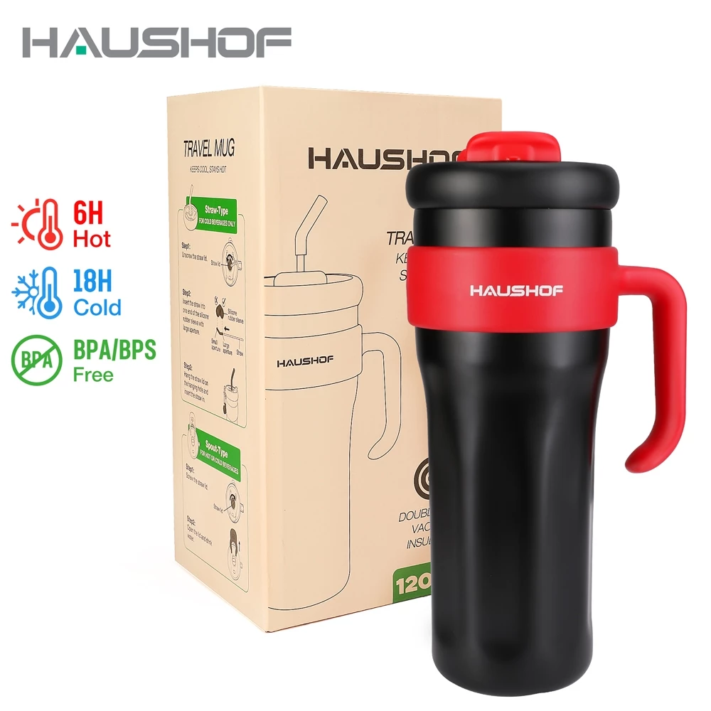 HAUSHOF 1200ml/40oz Tumbler with Handle Insulated Coffee Mug Stainless Steel Travel Mug Leak-proof Lid and Straw